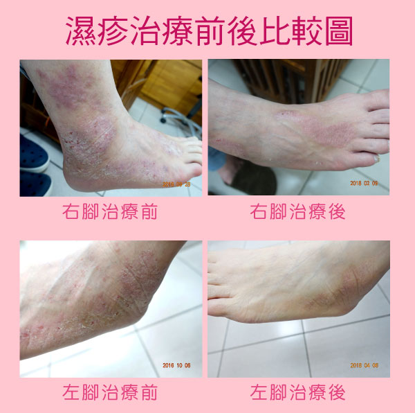 患者很認真的聽了,初期治療的1、2個月真的非常痛苦,長出許多水泡,又癢又紅腫,但是他堅持不懈繼續治療,一段時間後,他跟朋友出國旅遊,同住一間房的好朋友說:晚上沒有聽到你在搓腳的聲音耶!以前一起出去玩的時候,半夜總是會被嫌搓腳的沙沙聲,每每將朋友吵醒,但是這次出遊,發現搓腳的症狀已經改善。