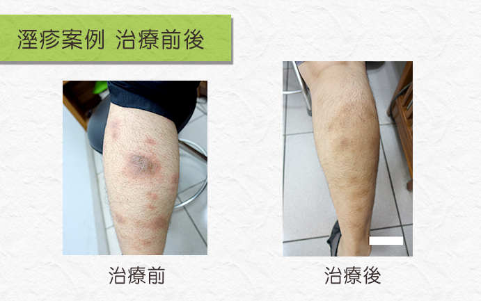 他下周回診的時候就跟我說,他耳朵、身體也發了,睡覺的時候就突然驚醒,耳朵有流水,他不知道水是從哪裡來的,我告訴他要繼續治療,你知道會這個樣子排溼毒所以要好好忍耐。大概1個多月後全身都退了,只剩小腿的部分,而現在小腿也幾乎都退了,皮膚恢復的很好,不像以前溼溼爛爛的也不癢了,治療也告一個段落。