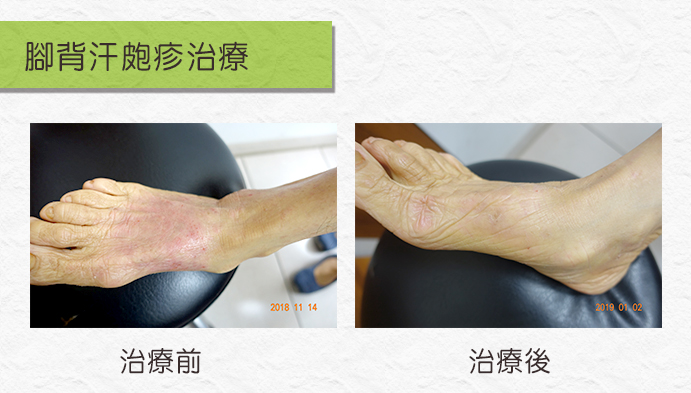 這位病人來這治療近半年,皮膚幾乎已回復正常狀態。治療期間她每周回診1次,我會觀察追蹤皮膚表面排出的狀況,也會開調理的中藥給她,等到治療過程的爆發期過去,再改用促使身體正常代謝的藥方,此時改為2周回診1次即可。通常進入中醫治療後,皮膚在1至2周就會開始往外發,體內溼氣不斷排出,最快時甚至3天全身就大發,7天後有人甚至耳朵還會出水,這不是壞事,因為發得快相對也好得快,所幸這位女病人只集中發在腳部,治療病況過程因人而異。