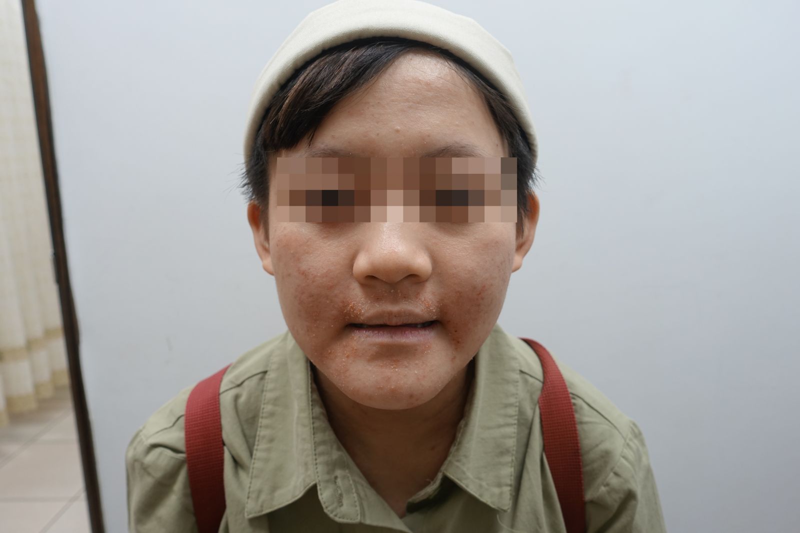 除了整張臉因發炎產生的紅腫、水泡和先前的傷口結痂,
