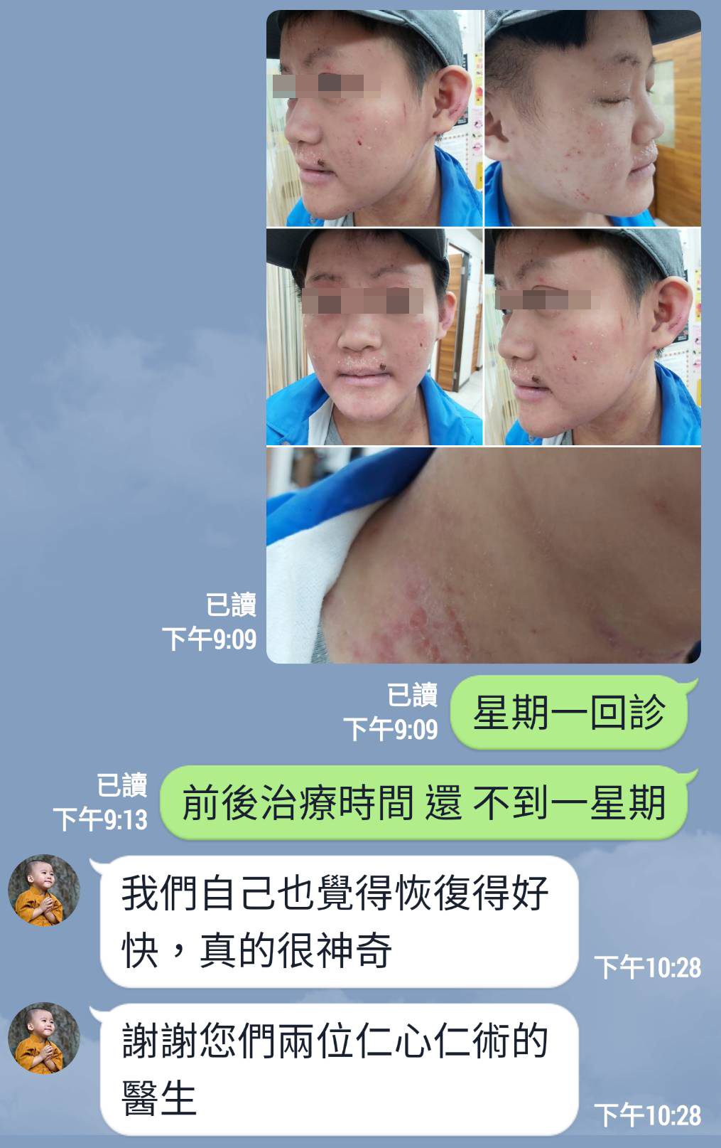 不到一星期的治療,臉上的紅腫和傷口已經癒合了7成,