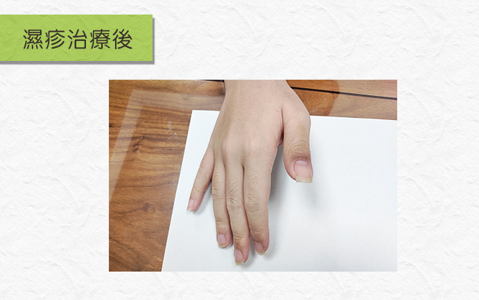 終於,阿光的濕疹就在按時吃藥、擦藥和飲食、作息的調理之下,1個多月就恢復了7成!原本的濕疹逐漸消退,手上的濕疹已經完全恢復,剩下腳上的些微傷口和小範圍濕疹需要持續治療,等待痊癒。