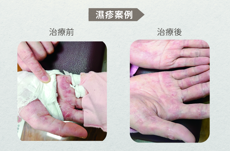 隨著濕疹的惡化,李小姐的雙手皮膚潰爛並經常滲出水狀液體,流出組織液,導致雙手疼痛、發癢且嚴重影響日常生活,李小姐不得不依賴紗布包裹雙手,以避免潰爛的皮膚接觸其他物品。此外,夜晚睡眠時,她的床單和棉被往往因雙手滲液而被浸濕,影響了正常作息,身心理皆感到非常困擾。多次求醫無效後,後來經網路搜尋,決定嘗試透過中醫治療方式尋求緩解。
