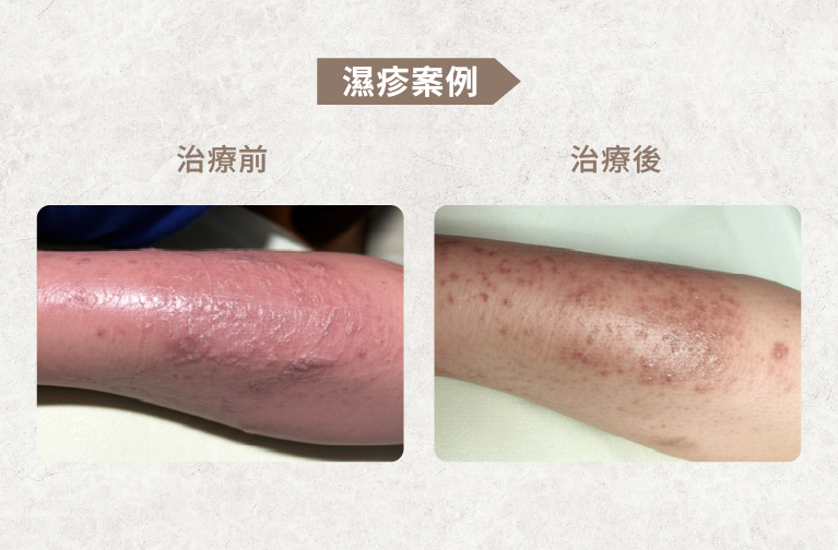 在治療期間,李小姐配合醫囑嚴格控制飲食,避免辛辣、酒精、牛肉、海鮮等刺激性與容易引發過敏的食材;每日也確實做好皮膚的清潔與保養。最重要的是,李小姐戒掉了過去習慣的晚睡行為,盡量在晚上12點前就寢,規律生活步調讓體內五臟六腑功能得以恢復。目前,李小姐仍持續接受調理中,皮膚狀況穩定,未再出現大面積濕疹復發。